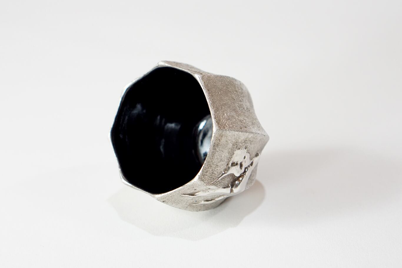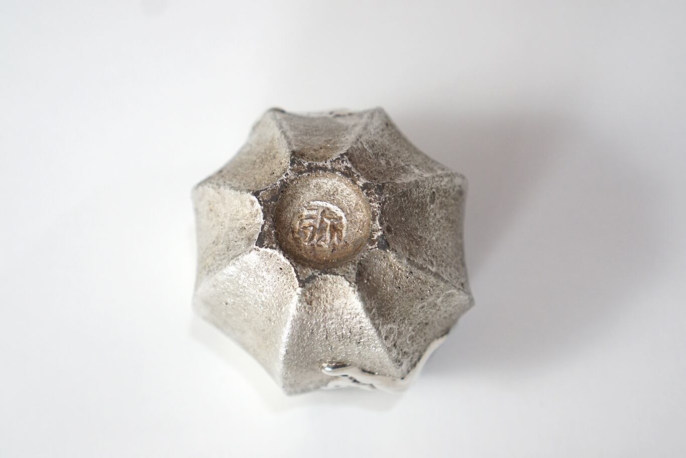 面取りした素焼き生地に内側に黒釉を掛け、釉薬で模様を流し掛け本焼き。その後、銀を塗り焼き付けています。流し掛けしている模様はやや艶があります。