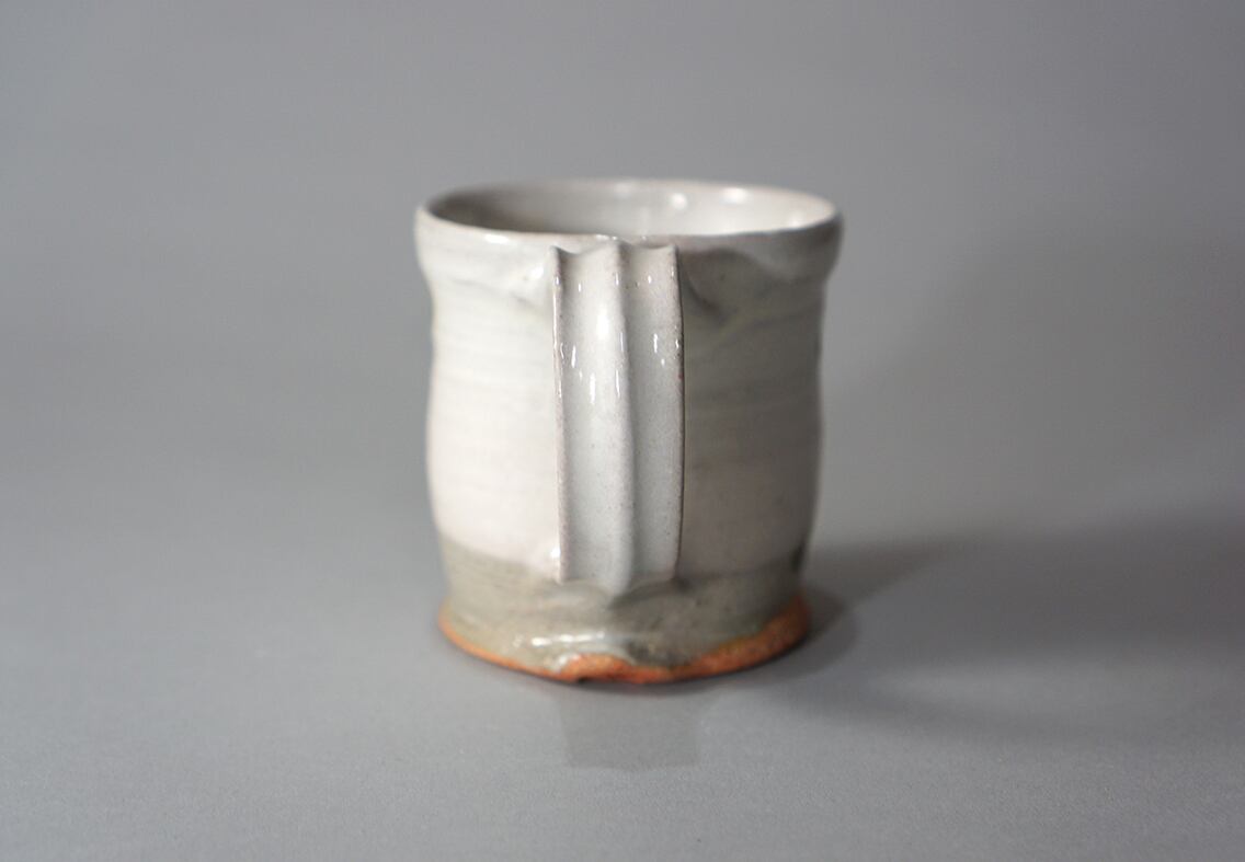 日常使いによいマグカップです。やや艶のある粉引の作品で、銅を使った緑釉による赤緑色の模様があります。太めの取ってで、持ちやすく、しっかりとした高台により安定感があります。